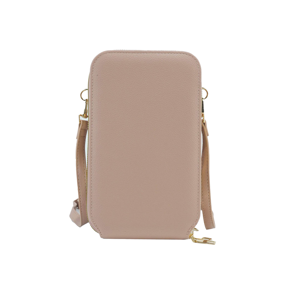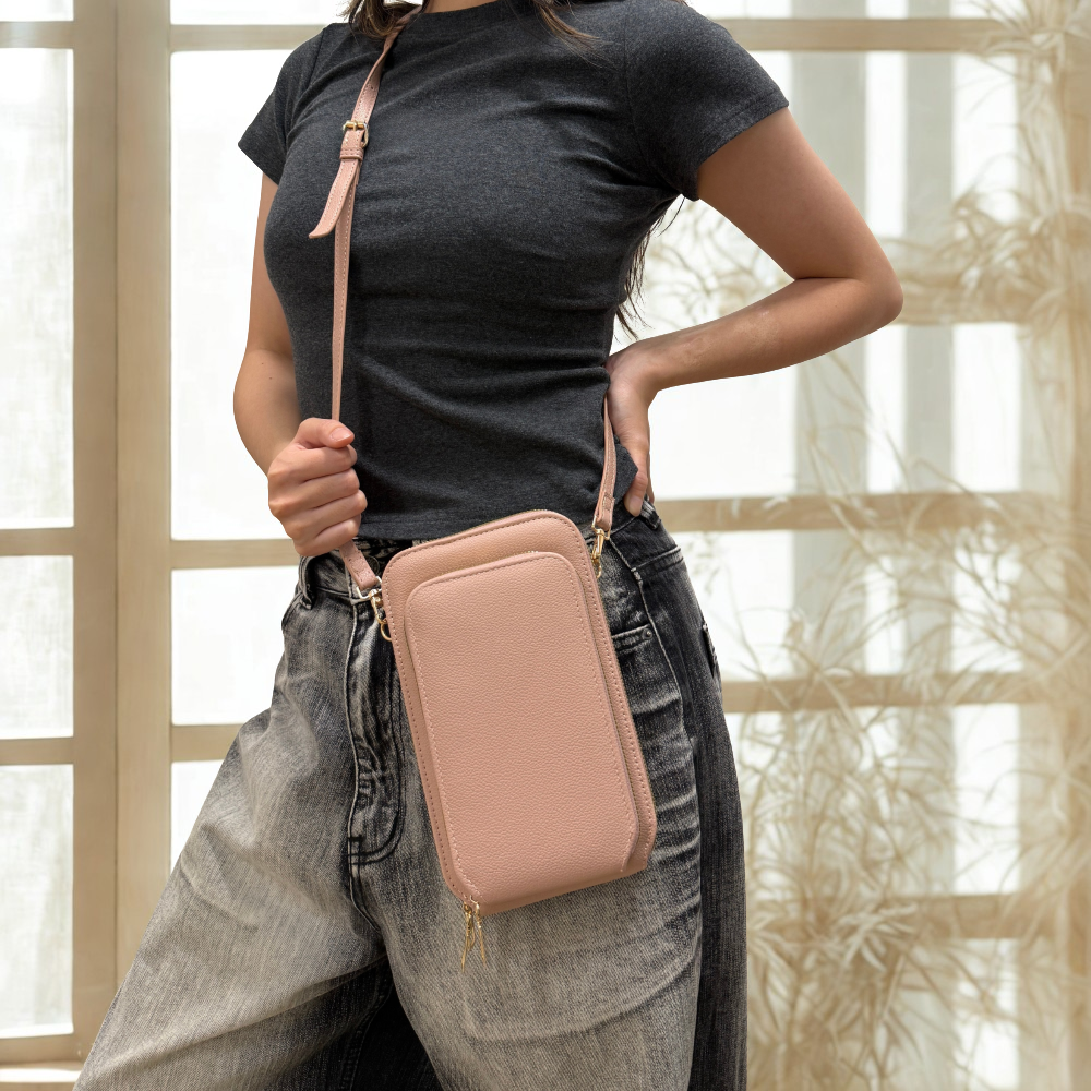 - Slim top zipped triple compartment crossbody designed for convenience and safety.