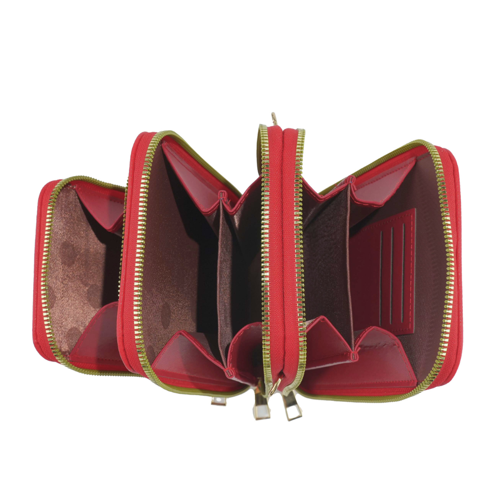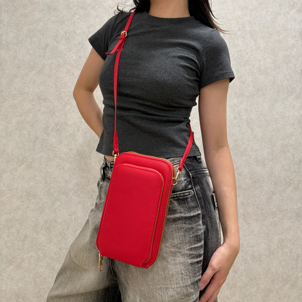 - Slim top zipped triple compartment crossbody designed for convenience and safety.